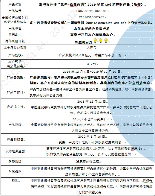 3.中国建设银行重庆市分行可根据市场情况等调整产品规模上、下限,并最迟于调整规模上下限当日进行公告。