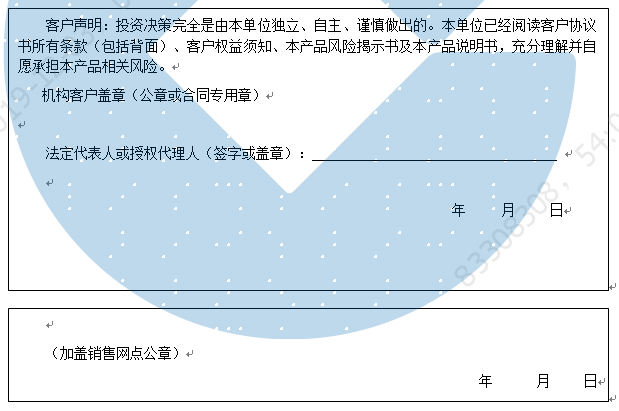 客户签名: ( 客户声明:投资决策完全是由客户独立、自主、谨慎做出的。客户已经阅读客户协议书所有条款(包括背面)、客户权益须知、本产品风险揭示书及本产品说明书,充分理解并自愿承担本产品相关风险。)