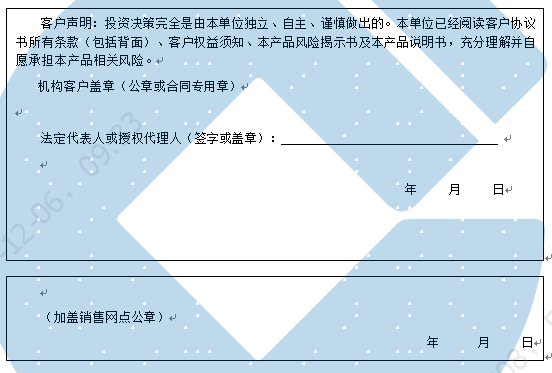 客户签名: ( 客户声明:投资决策完全是由客户独立、自主、谨慎做出的。客户已经阅读客户协议书所有条款(包括背面)、客户权益须知、本产品风险揭示书及本产品说明书,充分理解并自愿承担本产品相关风险。)