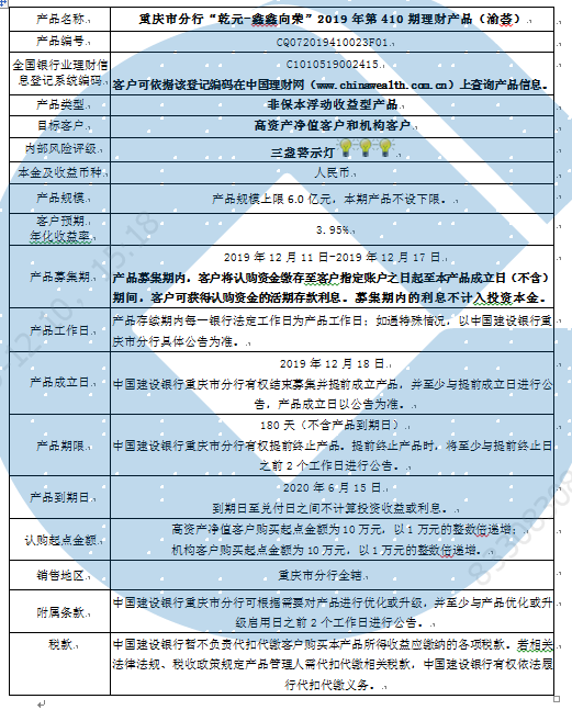 3.中国建设银行重庆市分行可根据市场情况等调整产品规模上、下限,并最迟于调整规模上下限当日进行公告。