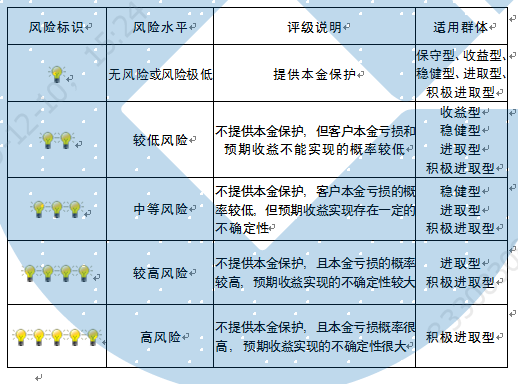 本产品为非保本浮动收益型理财产品,不保证本金和收益,请您充分认识投资风险,谨慎投资。本期产品期限为272天(中国建设银行有权对产品进行展期或提前终止),存续期内,产品不接受申购或赎回申请。本期产品内部风险评级级别为三盏警示灯 ,风险水平属于中等风险。最不利情况下,您将损失全部收益甚至包括全部本金。本理财产品适用于稳健型、进取型 、积极进取型客户。