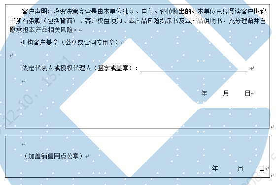 客户签名: ( 客户声明:投资决策完全是由客户独立、自主、谨慎做出的。客户已经阅读客户协议书所有条款(包括背面)、客户权益须知、本产品风险揭示书及本产品说明书,充分理解并自愿承担本产品相关风险。)
