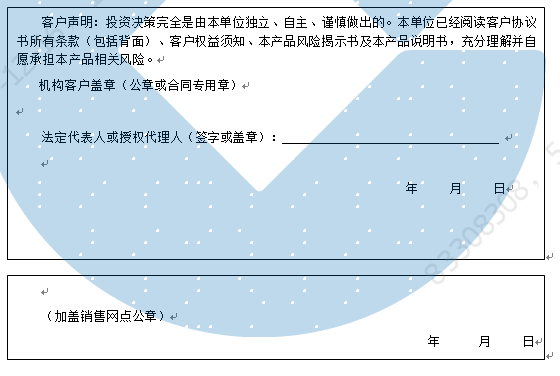 客户签名: ( 客户声明:投资决策完全是由客户独立、自主、谨慎做出的。客户已经阅读客户协议书所有条款(包括背面)、客户权益须知、本产品风险揭示书及本产品说明书,充分理解并自愿承担本产品相关风险。)
