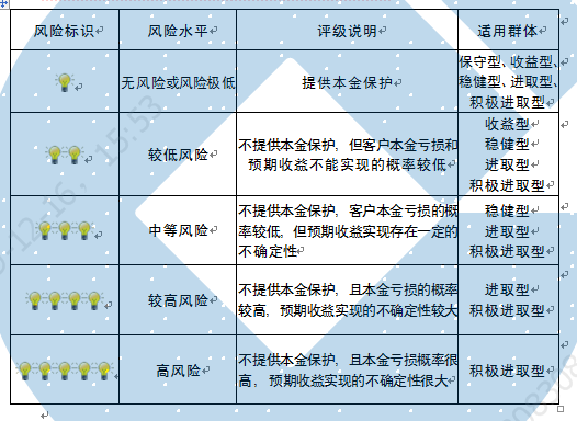 本产品为非保本浮动收益型理财产品,不保证本金和收益,请您充分认识投资风险,谨慎投资。本期产品期限为98天(中国建设银行有权对产品进行展期或提前终止),存续期内,产品不接受申购或赎回申请。本期产品内部风险评级级别为二盏警示灯 ,风险水平属于较低风险。最不利情况下,您将损失全部收益甚至包括全部本金。本理财产品适用于收益型、稳健型、进取型 、积极进取型客户。
