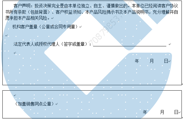 客户签名: ( 客户声明:投资决策完全是由客户独立、自主、谨慎做出的。客户已经阅读客户协议书所有条款(包括背面)、客户权益须知、本产品风险揭示书及本产品说明书,充分理解并自愿承担本产品相关风险。)