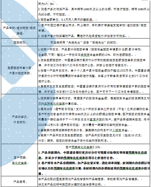 4.中国建设银行重庆市分行可根据市场情况等调整预期年化收益率,并至少于新的预期年化收益率启用日前进行公告。