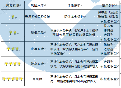 本期产品内部风险评级级别为二盏警示灯,风险程度属于较低风险。产品适合于收益型、稳健型、进取型、积极进取型客户。最不利情况下,基础资产无法回收任何本金和收益,客户将损失全部本金。客户不得使用贷款、发行债券等筹集的非自有资金投资本产品。
