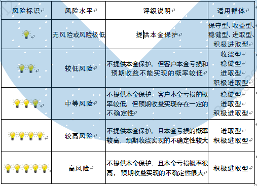 本期产品内部风险评级级别为三盏警示灯,风险程度属于中等风险。产品适合于稳健型、进取型及积极进取型客户。最不利情况下,基础资产无法回收任何本金和收益,客户将损失全部本金。客户不得使用贷款、发行债券等筹集的非自有资金投资本产品。