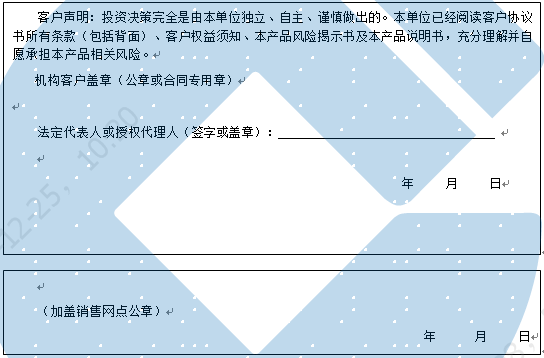 客户签名: ( 客户声明:投资决策完全是由客户独立、自主、谨慎做出的。客户已经阅读客户协议书所有条款(包括背面)、客户权益须知、本产品风险揭示书及本产品说明书,充分理解并自愿承担本产品相关风险。)