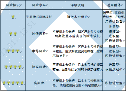 本期产品内部风险评级级别为两盏警示灯,风险程度属于较低风险。产品适合于收益型、稳健型、进取型及积极进取型客户。最不利情况下,基础资产无法回收任何本金和收益,客户将损失全部本金。客户不得使用贷款、发行债券等筹集的非自有资金投资本产品。