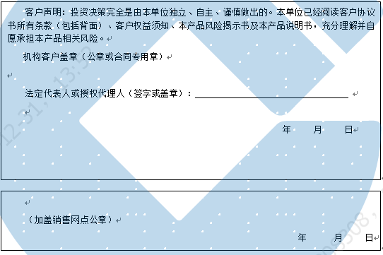 客户签名: ( 客户声明:投资决策完全是由客户独立、自主、谨慎做出的。客户已经阅读客户协议书所有条款(包括背面)、客户权益须知、本产品风险揭示书及本产品说明书,充分理解并自愿承担本产品相关风险。)