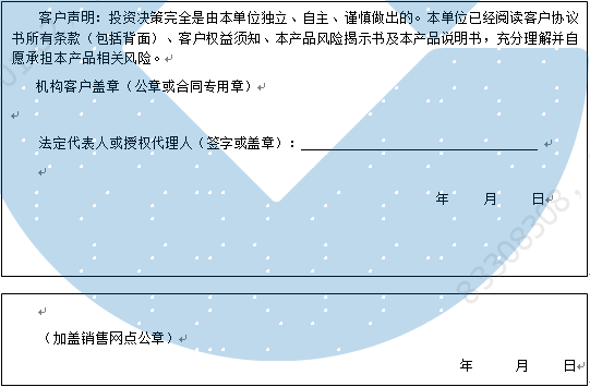客户签名: ( 客户声明:投资决策完全是由客户独立、自主、谨慎做出的。客户已经阅读客户协议书所有条款(包括背面)、客户权益须知、本产品风险揭示书及本产品说明书,充分理解并自愿承担本产品相关风险。)