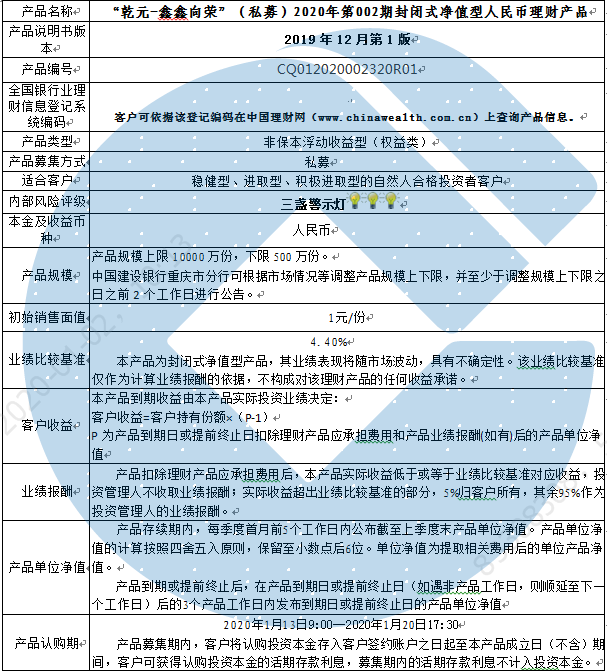 本产品为封闭式净值型理财产品,不保证本金和收益,请您充分认识投资风险,谨慎投资。本产品任何业绩比较基准、测算收益或类似表述均属不具有法律约束力的用语,不代表客户可能获得的实际收益,亦不构成中国建设银行重庆市分行对本产品的任何收益承诺。产品期限为固定期限(中国建设银行重庆市分行有权提前终止产品),存续期内产品不接受赎回申请。 本期产品内部风险评级级别为三盏警示灯,风险程度属于中等风险,适用于稳健型、进取型和积极进取型客户。最不利情况下,本期产品投资的资产无法回收任何本金和净收益,客户将损失全部本金。投资者不得使用贷款、发行债券等筹集的非自有资金投资本产品。如影响您风险承受能力的因素发生变化,请及时完成风险承受能力评估。