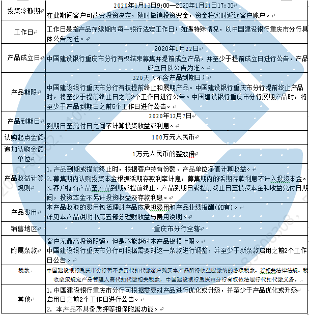 1.本产品规模上限:10000万份。在本期产品募集期内,对本期产品的认购份额达到本期理财产品规模上限,则中国建设银行重庆市分行有权利但无义务停止本期产品的认购,已经认购成功的客户投资权益不受影响。