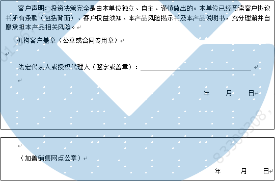客户签名: ( 客户声明:投资决策完全是由客户独立、自主、谨慎做出的。客户已经阅读客户协议书所有条款(包括背面)、客户权益须知、本产品风险揭示书及本产品说明书,充分理解并自愿承担本产品相关风险。)