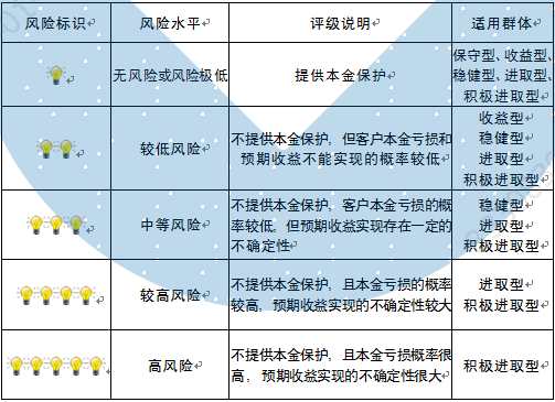 本期产品内部风险评级级别为三盏警示灯,风险程度属于中等风险。产品适合于稳健型、进取型及积极进取型客户。最不利情况下,基础资产无法回收任何本金和收益,客户将损失全部本金。客户不得使用贷款、发行债券等筹集的非自有资金投资本产品。