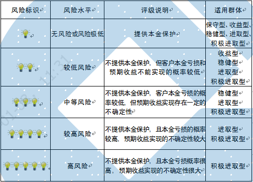 本期产品内部风险评级级别为两盏警示灯,风险程度属于较低风险。产品适合于收益型、稳健型、进取型及积极进取型客户。最不利情况下,基础资产无法回收任何本金和收益,客户将损失全部本金。客户不得使用贷款、发行债券等筹集的非自有资金投资本产品。
