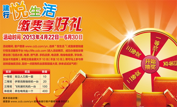 (一)登录http://life.ccb.com,选择云南地区指定缴费项目(包括水费、电费、燃气费、手机话费等)且缴费成功。缴费成功页面添加“立即抽奖”按钮,客户缴费成功后点击按钮,跳转抽奖页面开始抽奖。户点击抽奖转盘进行抽奖,系统实时提醒中奖与否。