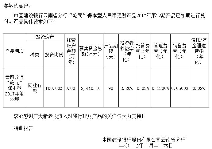 中国建设银行云南省分行“乾元”保本型人民币理财产品清算报告