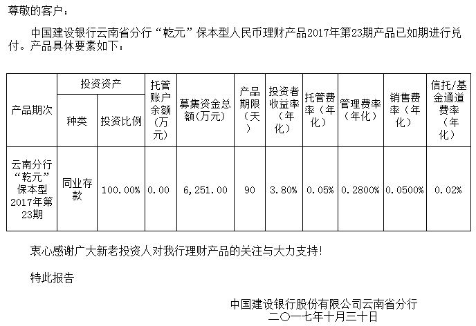 中国建设银行云南省分行“乾元”保本型人民币理财产品清算报告