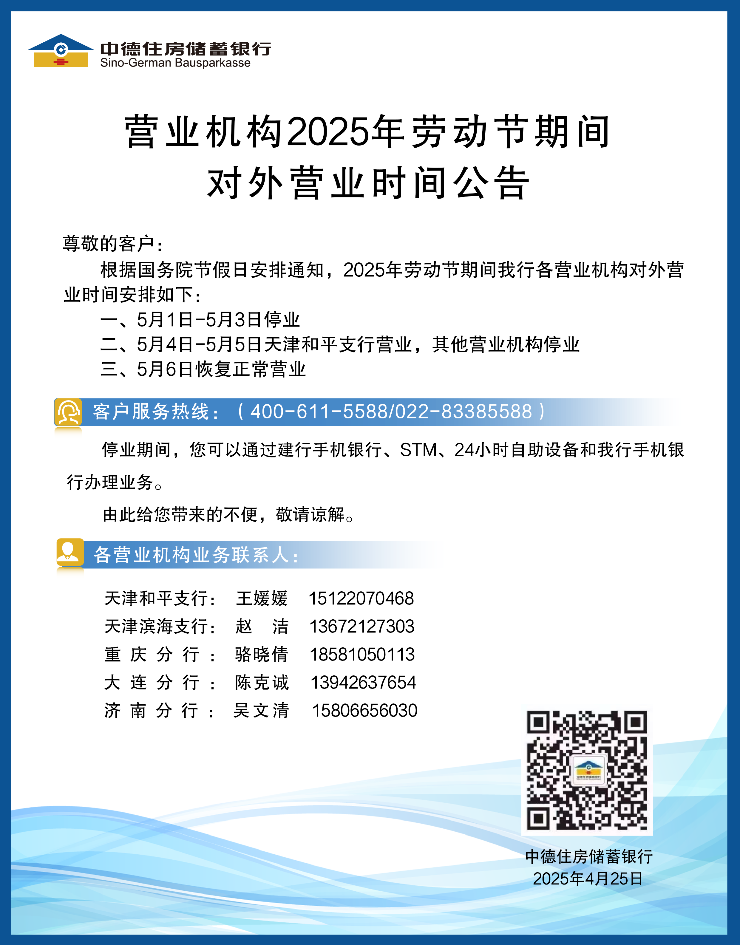 营业机构2025年劳动节期间对外营业时间公告