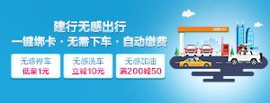 2019年6月30日前,绑定建行卡在指定停车场、加油站、洗车点、车检站可享“停车低至1元,加油满200减50,洗车立减10元,车检满30减30元“优惠,名额有限,先到先得。
