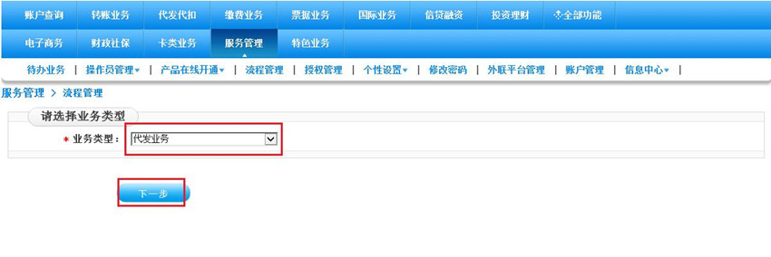 (1)主管登录企业网银,点击“服务管理-流程管理”,业务类型选择“代发业务”,点击“下一步”。