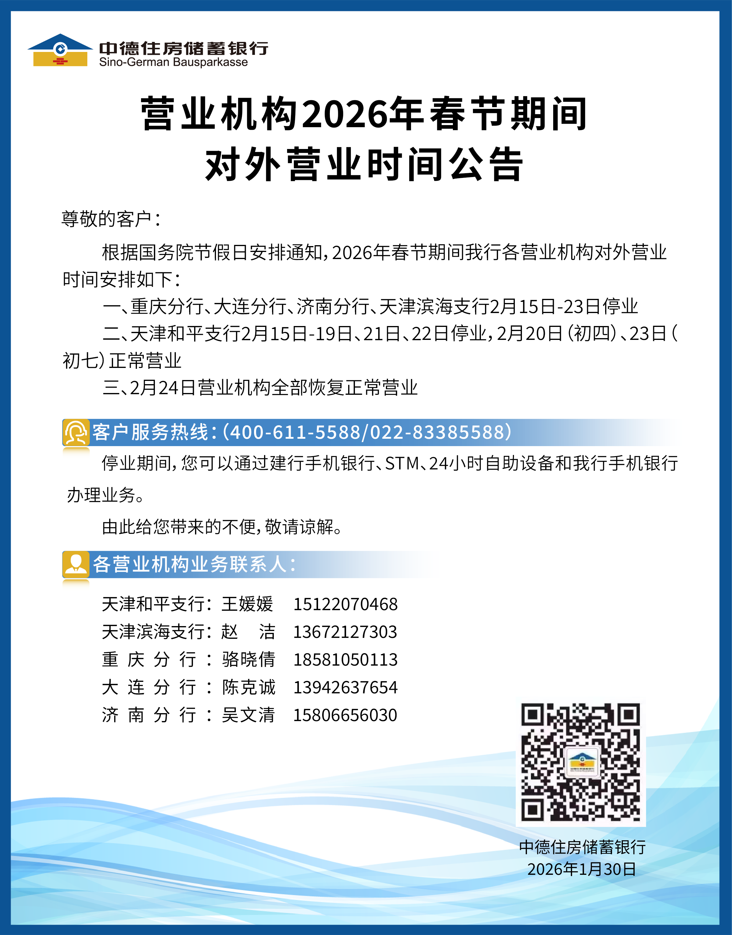 中德住房储蓄银行营业机构2026年春节期间对外营业时间公告