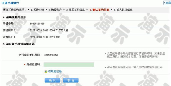 :确认签约信息,并进行预留手机号的短信验证码验证。