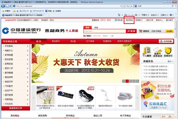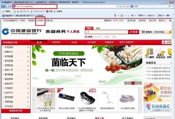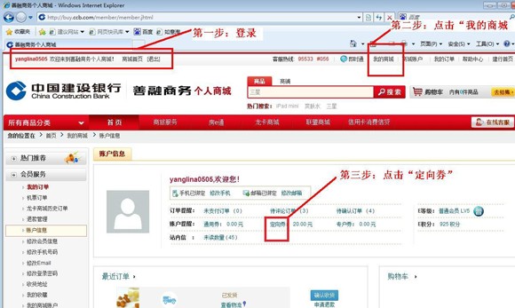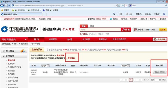 第一步:注册善融商务用户名并开通商城账户(操作流程详见网站www.ccb.com/nb服务指南栏位下《善融商务注册流程》) 第二步:登录善融商务个人商城(buy.ccb.com),点击首页左上角“会员登录” ![]() 第三步:登录后点击页面右上角“我的商城” ![]() 第四步:点击“定向券” ![]() 第五步:点击“我要获取”(获券成功后可在“我的商城”下“定向券”,“使用范围”中查看所获取的电子券使用范围,注意电子券使用不找零,每张仅限一次使用) ![]() 输入“电子券编号”、“验证码”,点击提交完成充值,如有多张电子券要进行充值,点击“添加”按钮 ![]() 注意:获券成功后可在“我的商城”下“定向券”,“使用范围”中查看所获取的电子券使用范围,注意电子券使用不找零,每张仅限一次使用。以下是查看电子券使用范围的详细操作流程: ![]() ![]() ![]() |