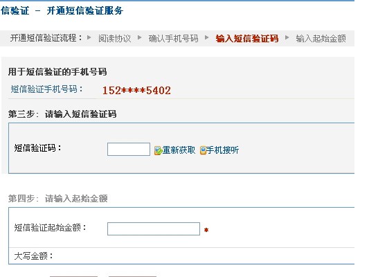 3、请您首先设置自己的短信验证起始额度,并输入接收到的短信验证码。(您设置的短信验证起始额度必须不超过5万元。如您未收到短信验证码,我行将有两种方式为您重新服务:重新获取和手机接听) ![]() |