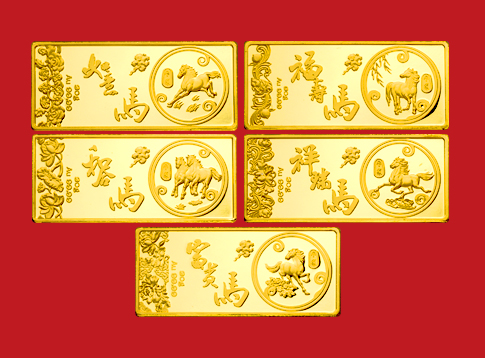 重量:30g*5 “如意马”金条正面为奔驰的骏马,驰骋万里,春风得意,花纹为中国传统吉祥图案“柿子”与“如意”的组合,寓意事事顺心、时时如意。 “福寿马”金条正面是一匹壮硕之马,清风杨柳吹过,处处洋溢福寿之气,左侧传统香草蝠“福”纹样做底,穿插寿桃“寿”纹样,寓意福寿同享、富贵安康。 “和合马”金条正面为两匹并排前行的骏马,和谐美满,左侧花纹为中国传统吉祥纹样“荷花”,寓意生活和谐、事业顺畅。 “祥瑞马”金条正面为一匹脚踏祥云奔跑的祥和之马,温馨、祥瑞之感跃然而上,左侧花纹采用传统吉祥纹样“牡丹”“蝠(福)纹”,寓意和谐吉祥,繁华祥瑞。 “富贵马”金条正面为一匹矫健的马儿,奔向富贵之路,左侧纹样由中国典型吉祥花卉“牡丹”及“莲花”组合而成,寓意人生得意、富贵一生。