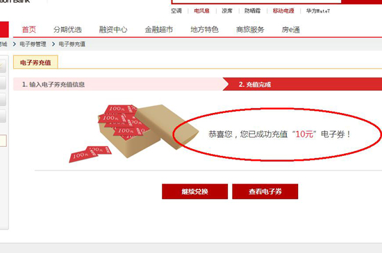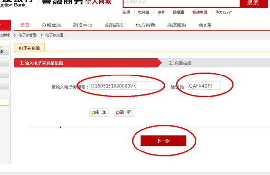 5. 输入抽奖获得的电子券编号、验证码,生成善融商务电子券。一定注意验证码区分大小写。