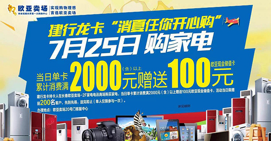 活动二:建行龙卡持卡人在长春欧亚卖场-2F家电家电城,当日单卡累计消费满2000元(含)以上赠送100元欧亚现金储值卡(单人单卡仅限参与一次且仅赠送100元现金储值卡)活动当日限赠前200名客户,先到先得,送完即止。