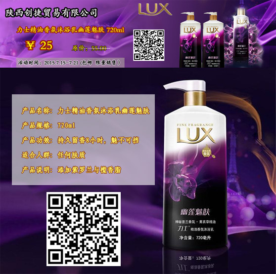 原价55元 现价25元 包邮限量优惠开售!!全新LUX幽莲魅肤 特别撷取神秘墨兰极致盛放的刹那芬芳 持久留香8小时,尽显妩媚感性与活跃沁爽!